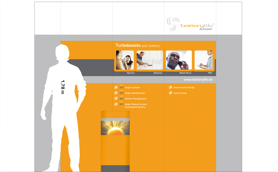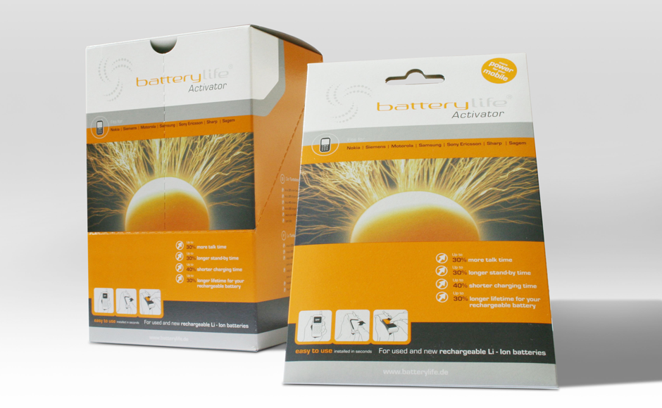 Entwurf eines hochwertigen impactstarken Packaging Designs, welches die technische Innovation des batterylife Activators kommuniziert. Das modulare Unternehmenslogo wird durch den Zusatz der Produktbezeichnung „Activator“ auch zum Produktlogo.